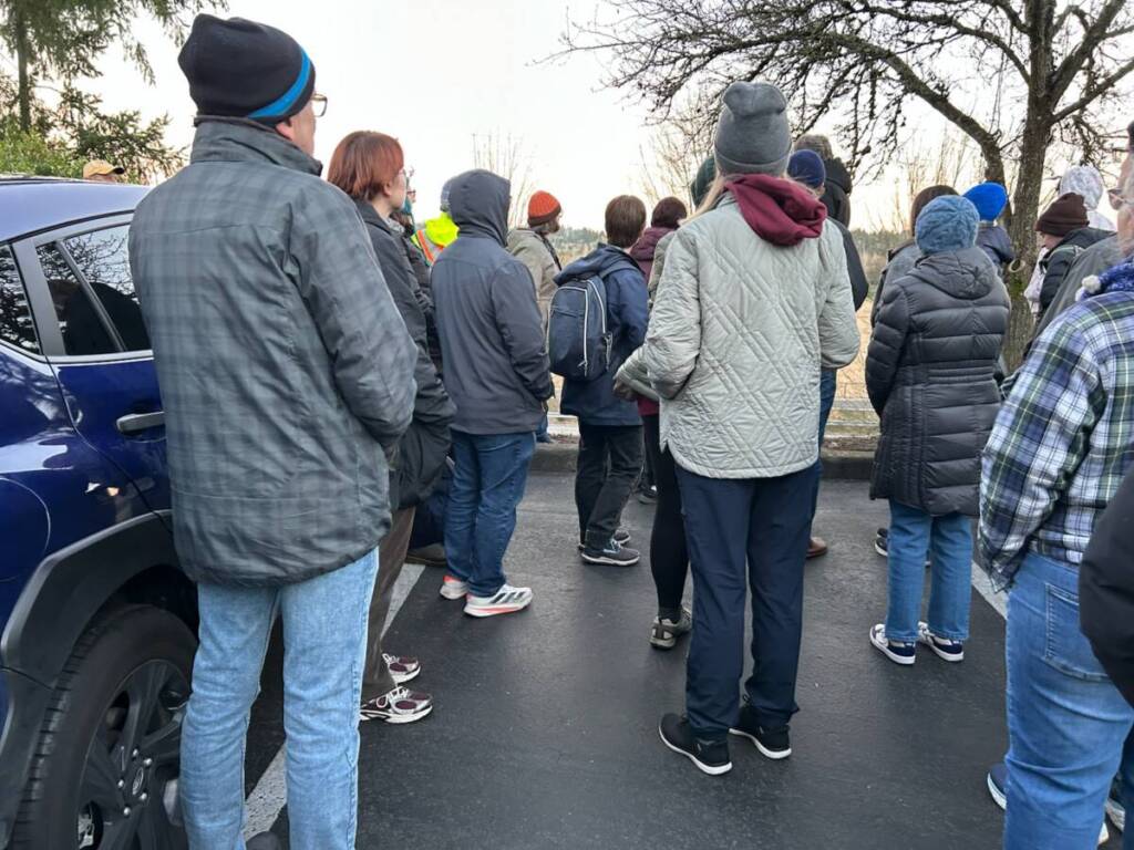 We gathered just before dusk at a business park across busy Willows Road NE from the roost at Sammamish Valley Park. From there we could see the crows fly in, starting as a trickle then peppering the winter sky in what scientists call an “a pre-roost aggregation.” When it finally got too dark to see them, we crow watchers headed for the warmth and comfort of a community center lecture hall to learn about what we’d just witnessed.